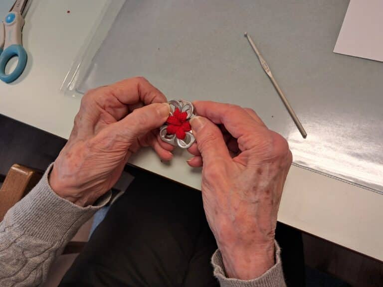 Kädentaidot -ryhmässä askarreltiin kauniita rintakoruja tölkkien nipsuista.