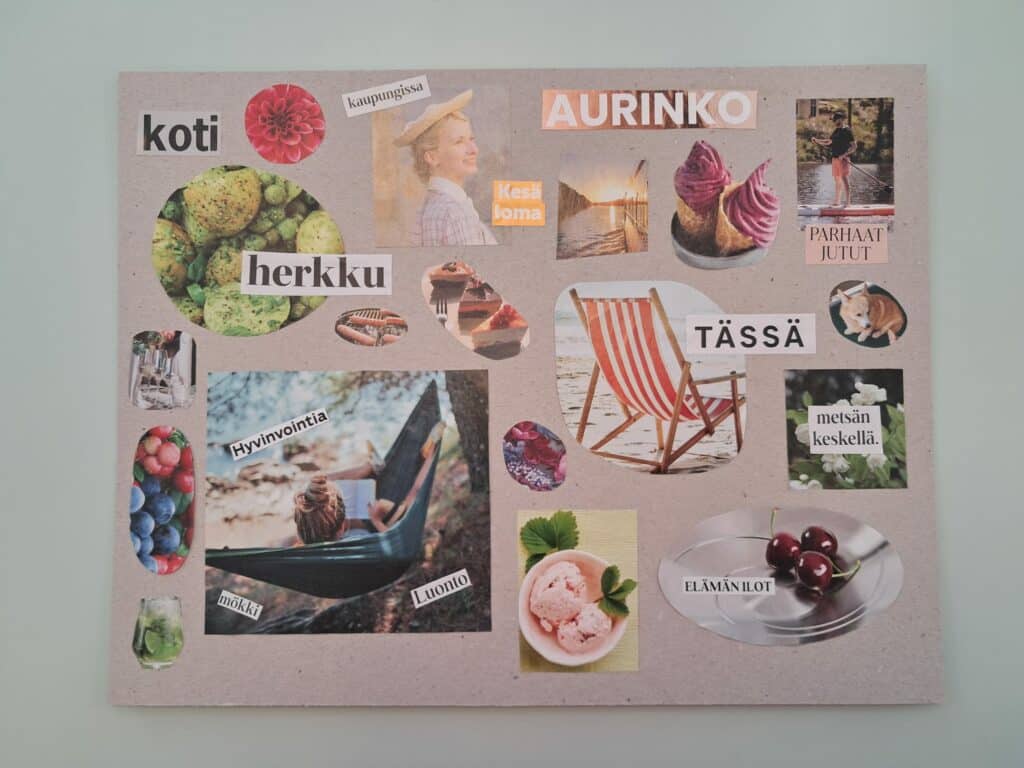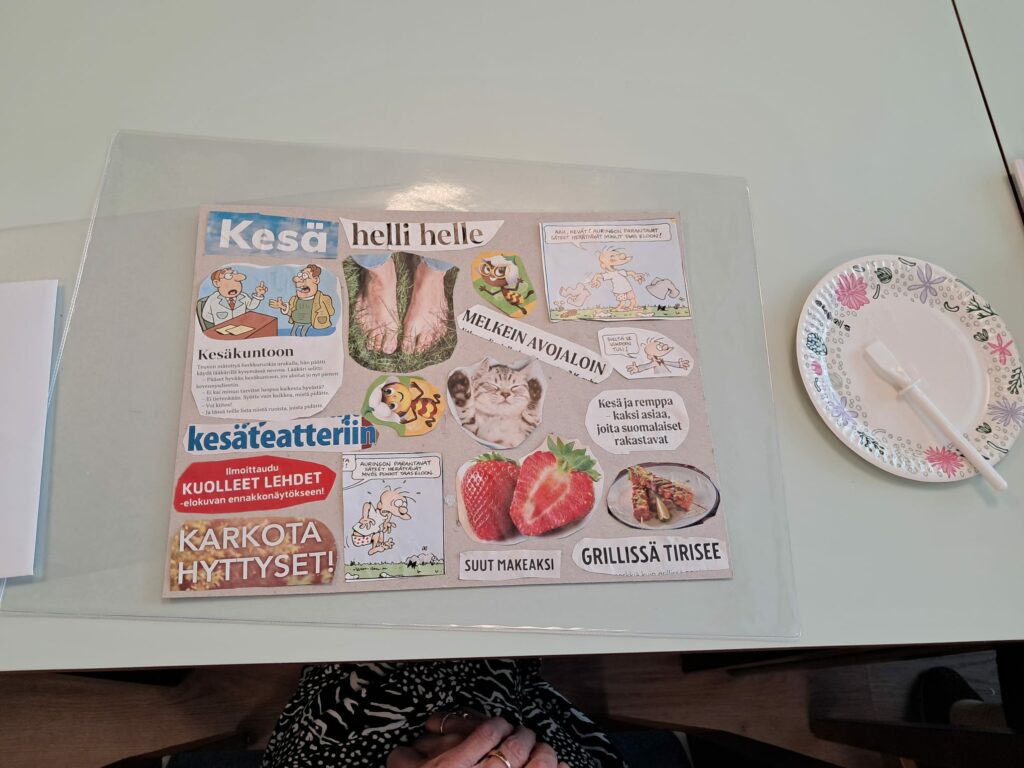 Kesäiset kuvakollaasit valmistuivat kädentaidot -ryhmässä. Lehdistä leikattiin kesään sopivia kuvia ja tekstejä, jotka sommiteltiin ja liimattiin oman mielen mukaan taustapahville.