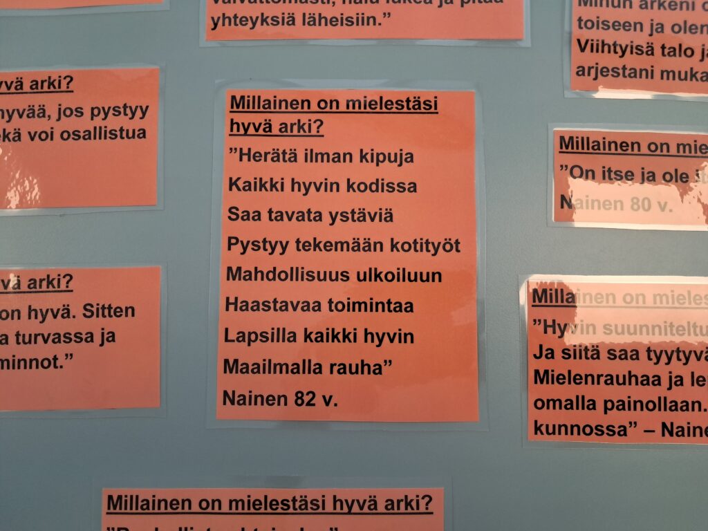 Vanhusten viikon tämän vuoden teemana on ”Hyvä arki, hyvä mieli”. Talon asukkailta on kyselty, millaista on heidän mielestään hyvä arki. Vastauksia on ripustettu vastaanoton tiskin edustalle, josta jokainen voi käydä lukemassa nimettöminä annettuja vastauksia.  Asukkaat ovat keskustelleet yhdessä samasta aiheesta myös keskiviikon keskustelukerhokerhossa.