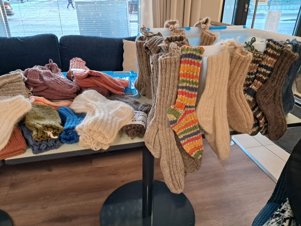 Saga Torilinnan asukas Eeva-Liisa on myynyt jo viikon ajan tekemiään villasukkia talon ravintolassa. Valikoimasta löytyy monen väristä ja kokoista sukkaa, jokaiselle jotakin. Osa sukista on tehty lampaanvillasta ja koirankarvalangasta.