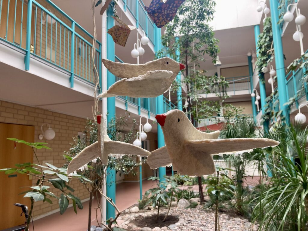 Kesän alussa monen viikon preojektina oli tehdä lintumobile yleisiin tiloihin. Valkoisiin lokkeihin toi kontrastia origamilinnut värikkäistä papereista.