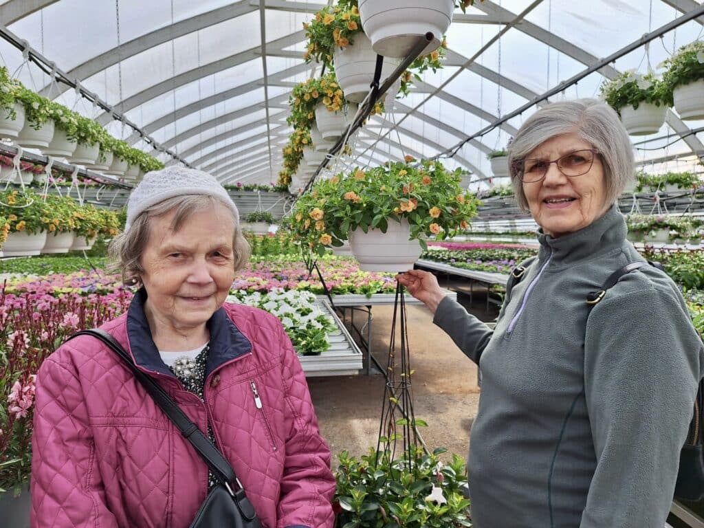 Perillä meitä odottivat kasvihuoneet pullollaan kauneutta. Pelargonit hohtivat lukuisissa väreissä, samoin petuniat sekä miljoonakellot. Taidokkaasti yhdistetyt kesäkukka-amppelit kasvavat suuriksi ja ilahduttavat koko kesän.