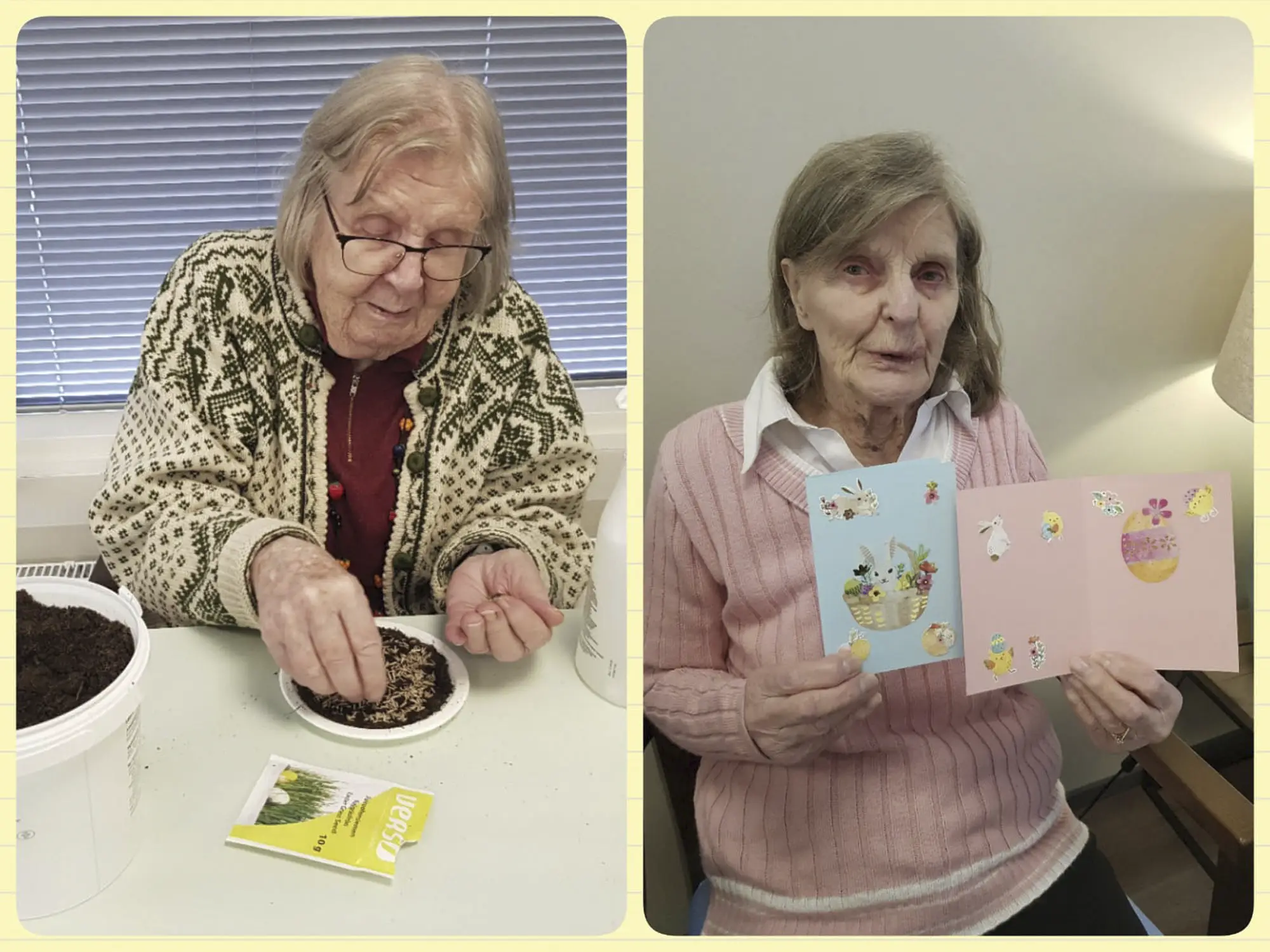 Saga Torilinnassa on pääsiäisvalmistelut jo hyvässä vauhdissa. Rairuoho on laitettu kasvamaan ja kauniin sävyiset kortit on koristeltu teeman mukaisesti.