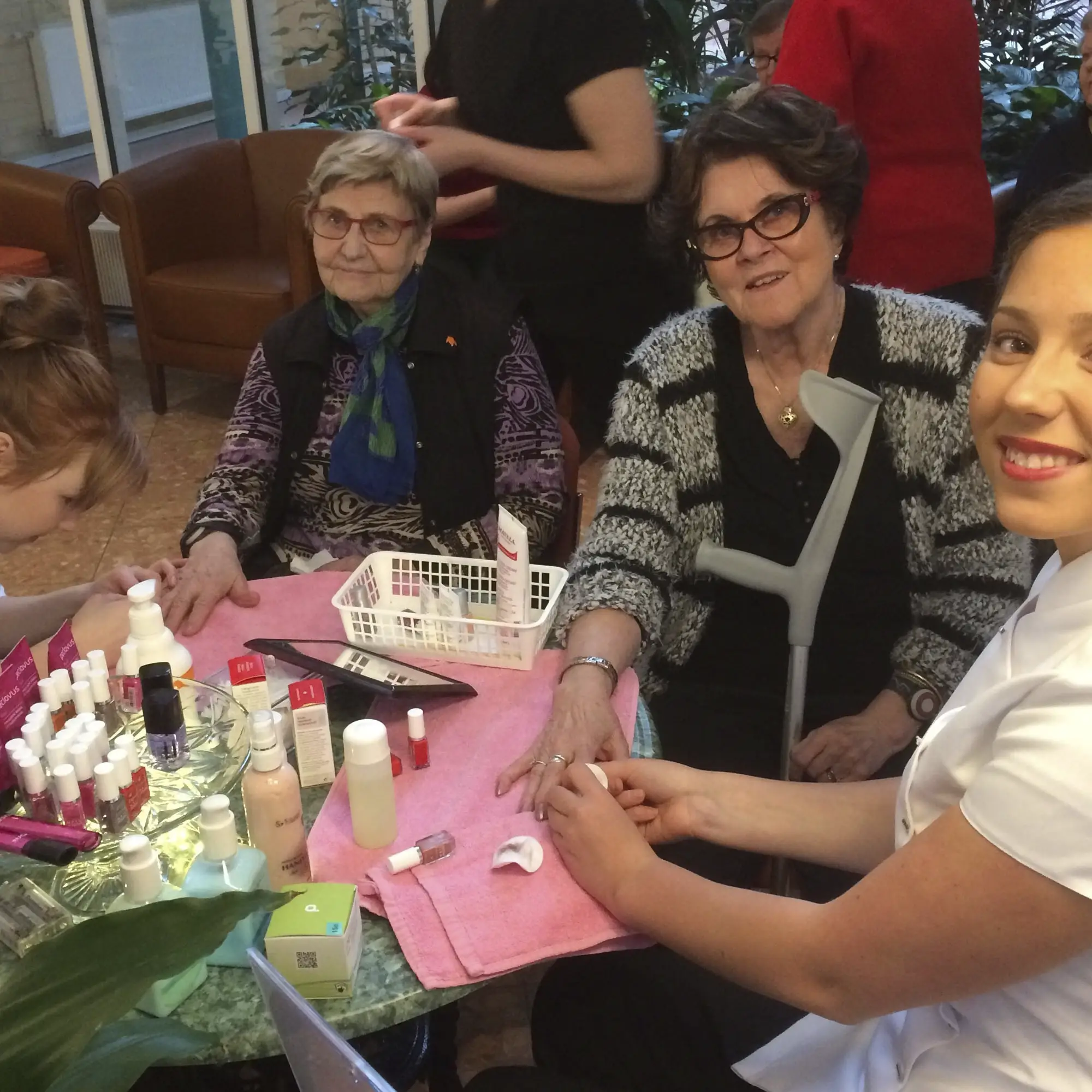 Torstaina vietettiin Saga Kaskenpuistossa kansainvälistä naistenpäivää monin eri ohjelmin. Aamu aloitettiin kuuntelemalla kauniita lauluja naisista: Armi, Anneli, Anna-Liisa, Leila, Saariston Sirkka! Lounaalla kaikki naispuoliset asiakkaat saivat ravintolan tarjoamina upean ruusun kotiinsa ja aulassa kuunneltiin alusvaatteiden historiaa Naantalin matkailun oppaan, Mirja Kujalan johdolla. Päivän päätteeksi naistenpäivän hömpötyksiä aulassa. Voi, kuinka ihanaa oli saada kädet kauniiksi ja olla hemmoteltavana! Kosmetologikoulun oppilaat tekivät pikakäsihoitoja ja kynsien lakkausta asukkaille. Lisäksi aulassa oli muita esittelijöitä.