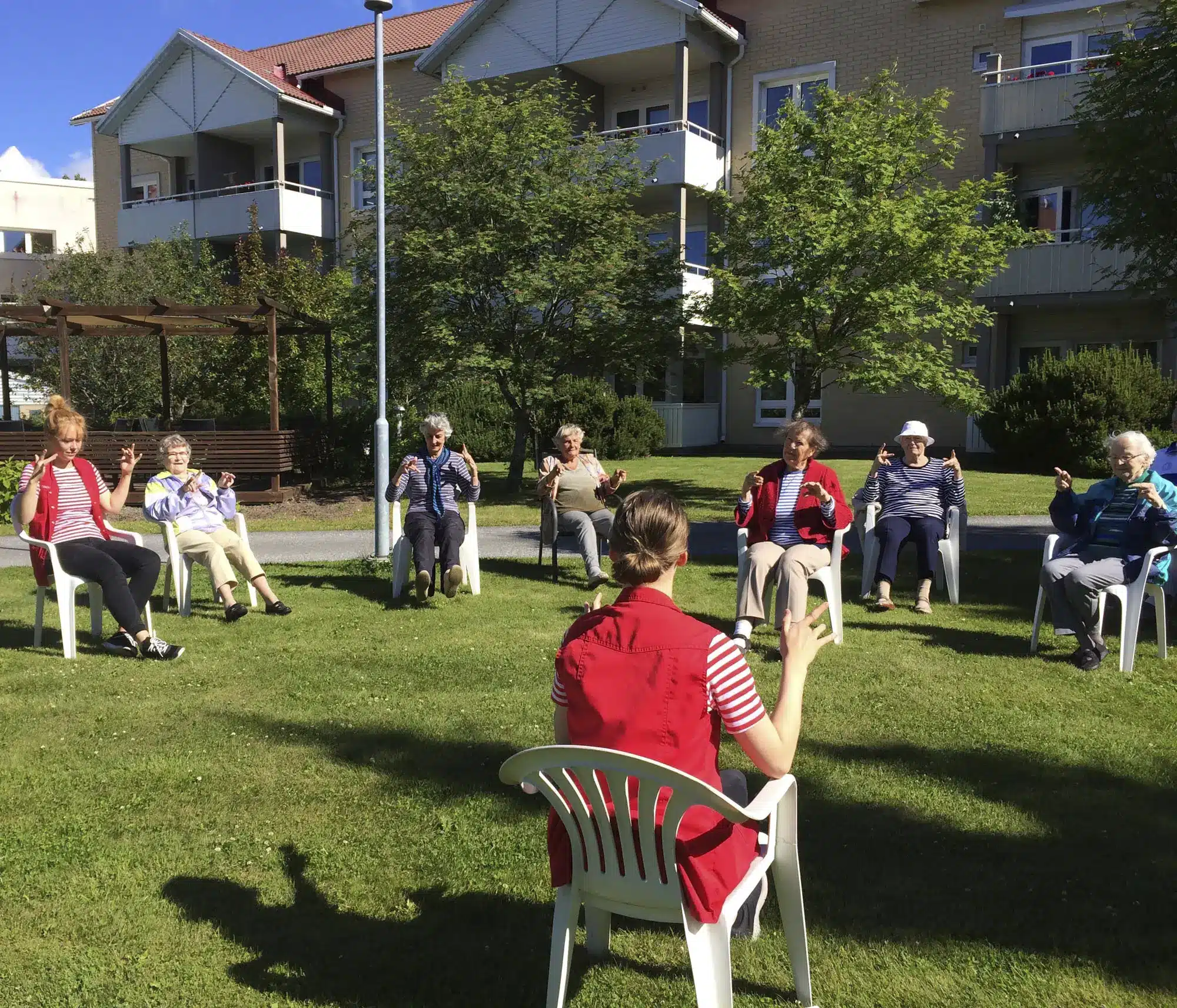 Aurinkoinen sää houkutteli Saga Kaskenpuiston asukkaita ulos jumppahetkeen torstaiaamuna.