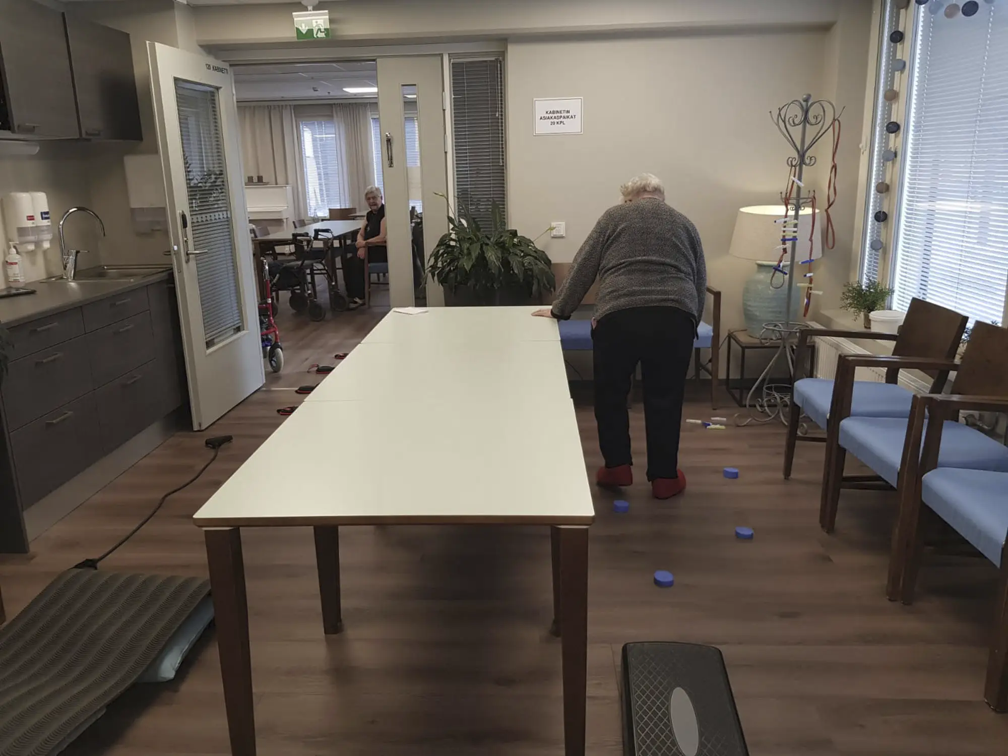 Tällä viikolla asukkaiden tasapainoa haastettiin fysioterapeutin rakentamalla tasapainoradalla. ”Tää on hyvä ja hauska tapa harjoittaa tasapainoa.” ”On mukava huomata, että kyllä mie vielä pystyn”, totesivat ryhmään osallistuneet asukkaat Kaarina ja Helli.