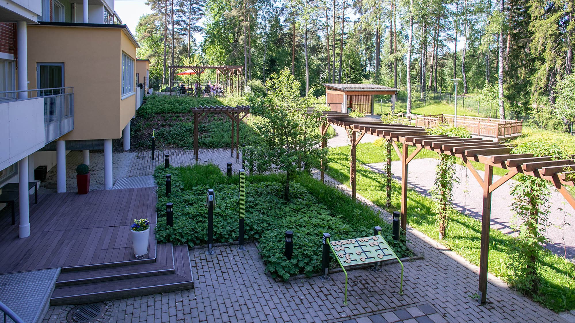 Den ljusa och rymliga miljön är inredd med högklassiga material, genomtänkta detaljer och dämpade färgnyanser, inspirerade av sand och hav. I de gemensamma utrymmena finns det bl.a. gym, bibliotek, klubbrum, bastu och terapibassäng. Restaurangen och kaféet erbjuder träffpunkter för trevligsamvaro. Dessutom finns det en frisersalong, fotvård, fysioterapi och en underhållstekniker i huset. Den skyddade gårdsplanen erbjuder olika utespel, mysiga sittgrupper och en grill.