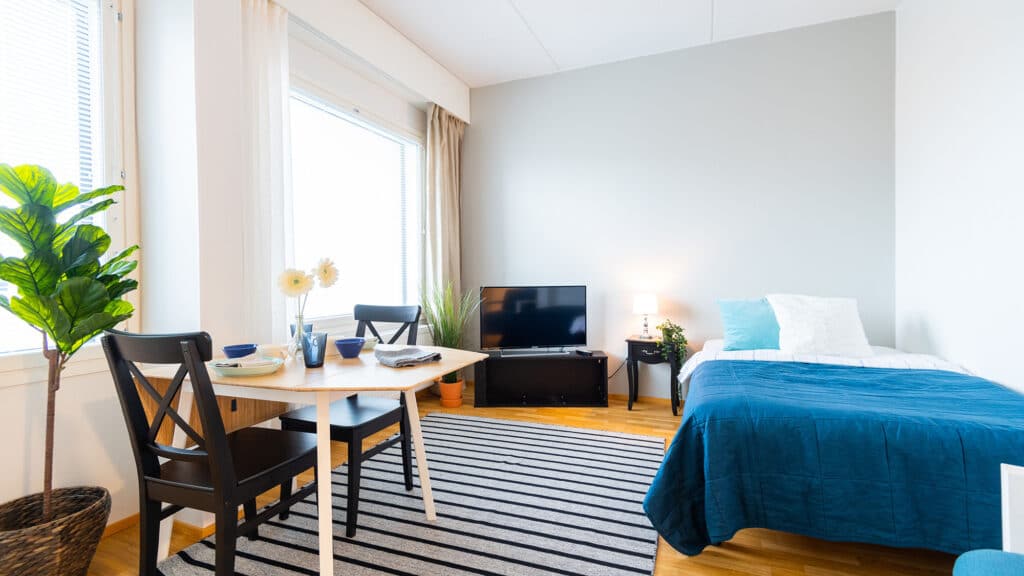 Esteetön yksiö, jossa on tilava eteinen, moderni keittiötila, avara asuinhuone sekä reilu kylpyhuone. Suihkutilassa on seinään kiinnitetty suihkutuoli. Keittiössä on astianpesukone, jääkaappipakastin, keraaminen liesi ja uuni. Kylpyhuoneessa on pesukoneliitäntä.