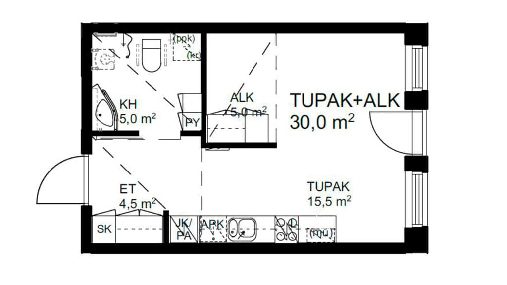 Esteetön yksiö, jossa on tilava eteinen, moderni keittiötila, avara asuinhuone sekä reilu kylpyhuone. Suihkutilassa on seinään kiinnitetty suihkutuoli. Keittiössä on astianpesukone, jääkaappipakastin, keraaminen liesi ja uuni. Kylpyhuoneessa on pesukoneliitäntä. Ranskalainen parveke.